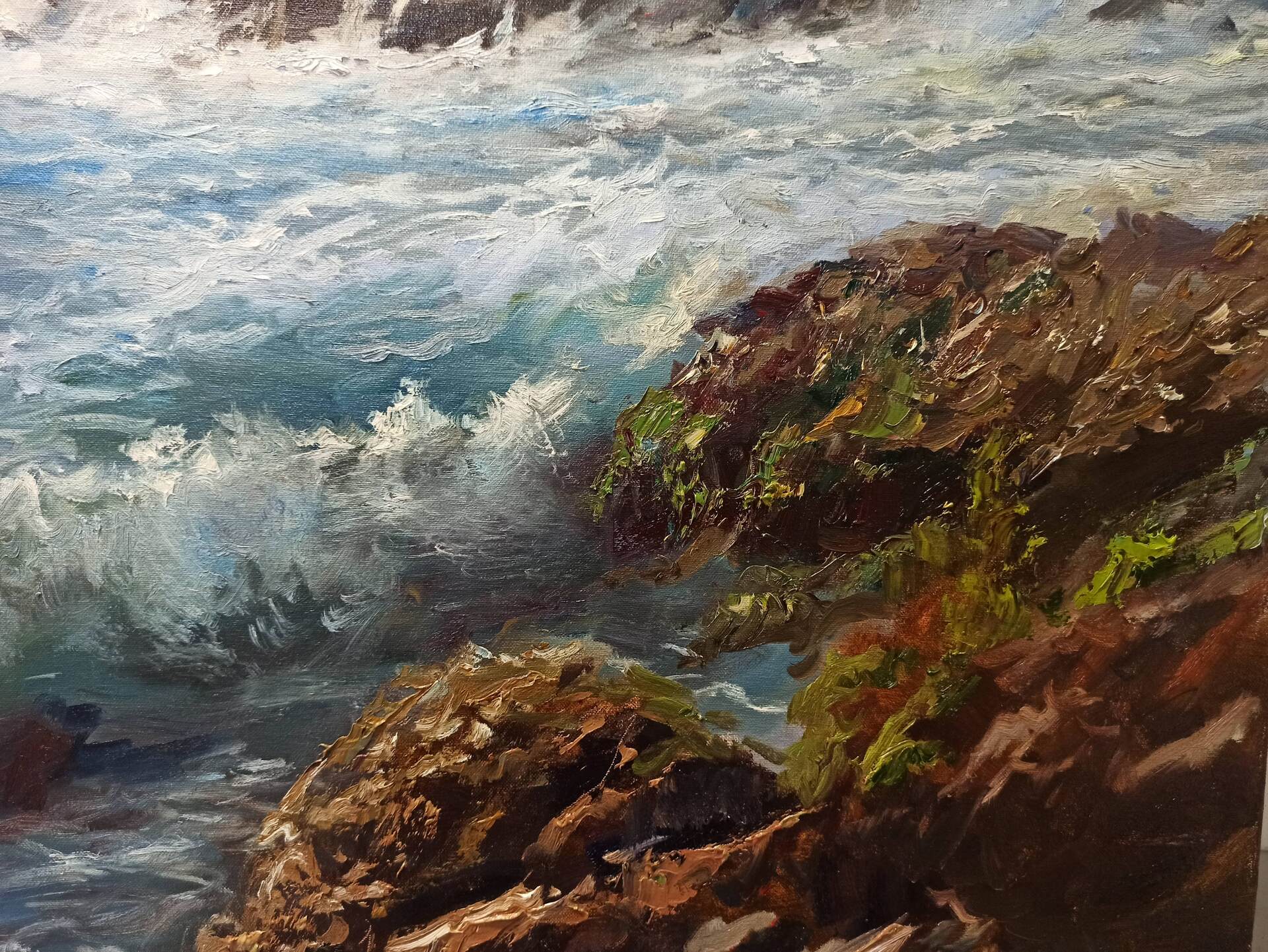Waves and water motivation against the rocks on the beach and exited seabird is one of my favorite subjects in many of my artworks.