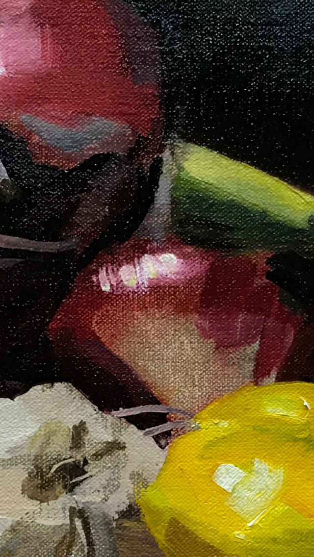 Modern impressionist still life, painted in the VAS studio of assorted fruits and vegetables.